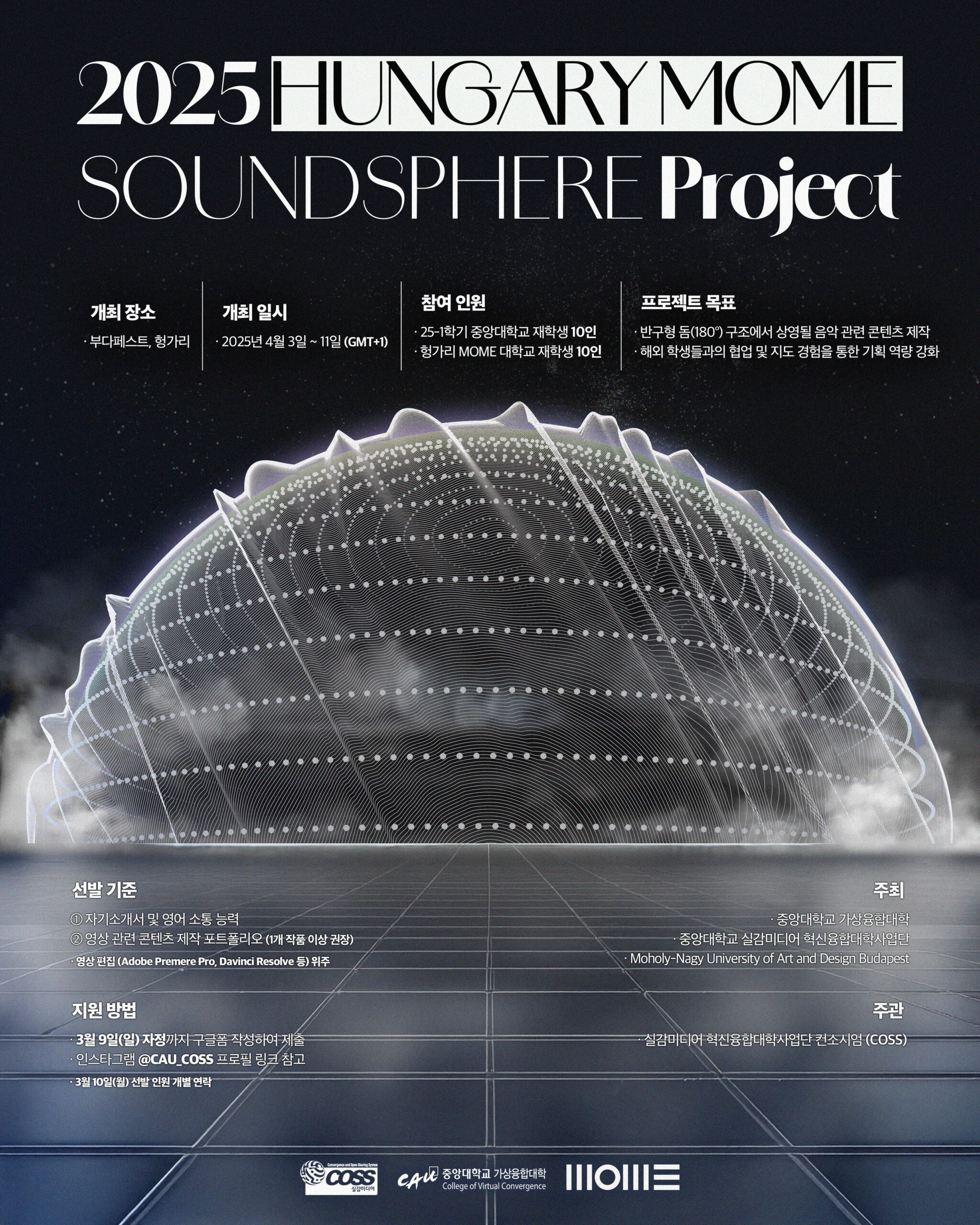 헝가리 부다페스트의 MOME 대학과 함께하는 특별한 반구형 돔(180°) 콘텐츠 제작 프로젝트에 참여할 중앙대학교 재학생을 모집합니다!