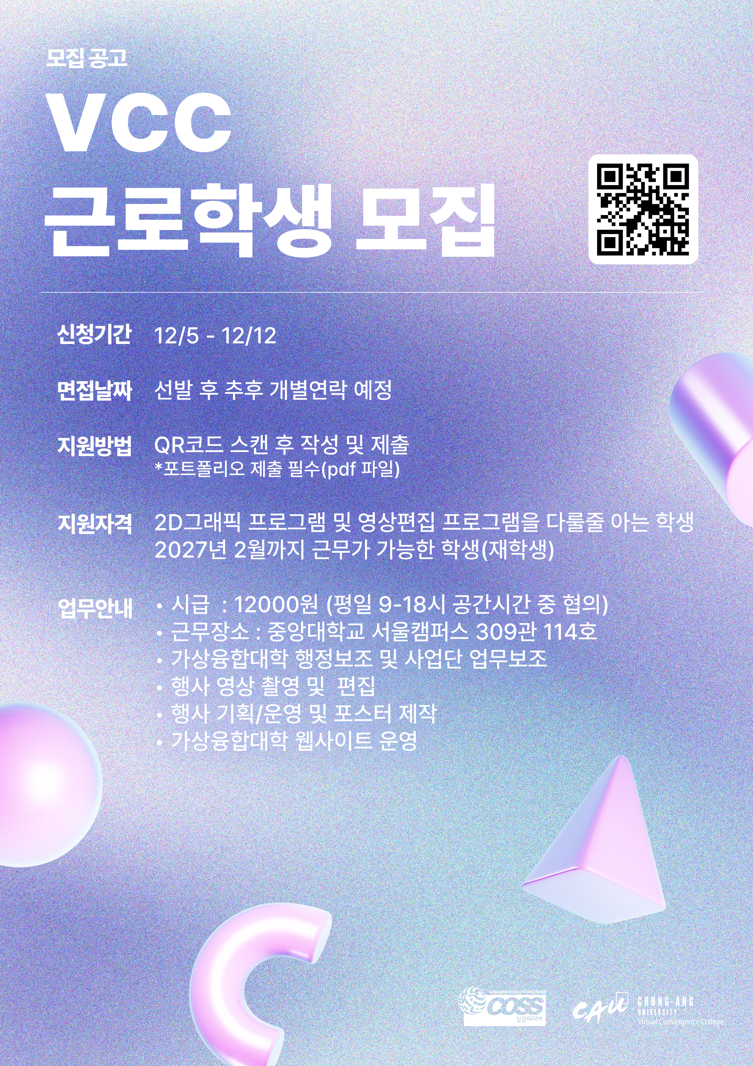 VCC 근로 학생 모집 (2025년 12월 5일(금) ~ 12월 12일(금))